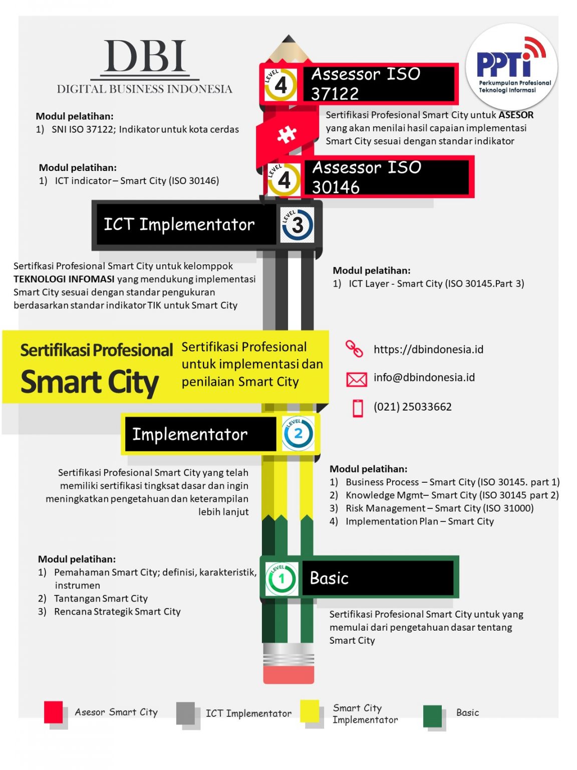 Untuk dapat menerapkan konsep Smart City yang baik dan benar diperlukan pengetahuan dan keterampilan sesuai dengan praktik terbaik yang ada, baik tingkat nasional maupun internasional. Sertifikasi Profesional Smart City – BASIC ini membahas pengetahuan awal tentang smart city sebagai pondasi untuk implementasi Smart City. Pelatihan tingkat BASIC ini akan membantu peserta memahami atau mengetahui tentang Kota Cerdas kemudian mampu membuat rencana strategis Kota Cerdas, sehingga dapat membantu implementasi program Kota Cerdas di wilayah masing-masing.
